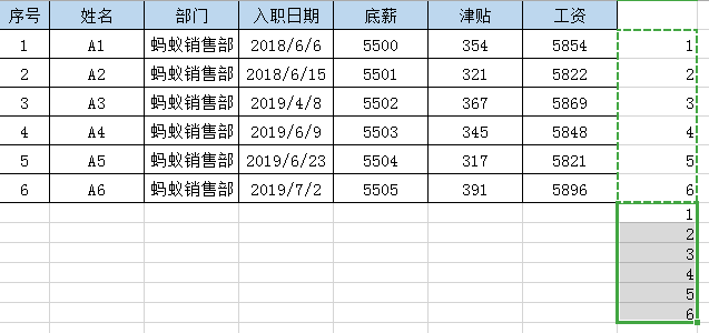 第二步:选中辅助列序号并复制,在最后一个序号下方的单元格进行粘贴