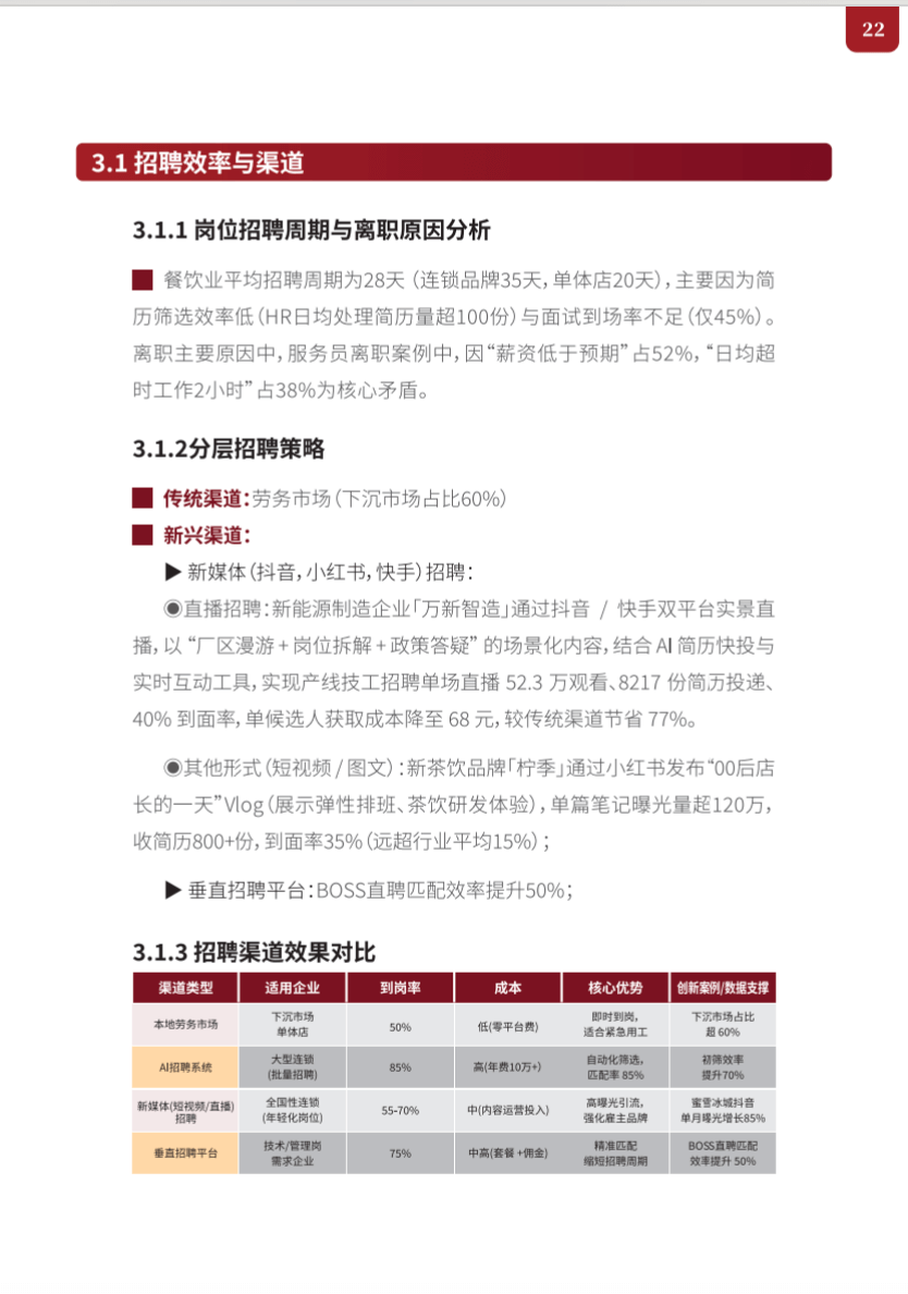 - 人荒难解:中国餐饮业年均180-200万的人才缺口,招聘周期不断拉长(店长岗超55天),单店招聘成本蚕食月营收3%-6%。